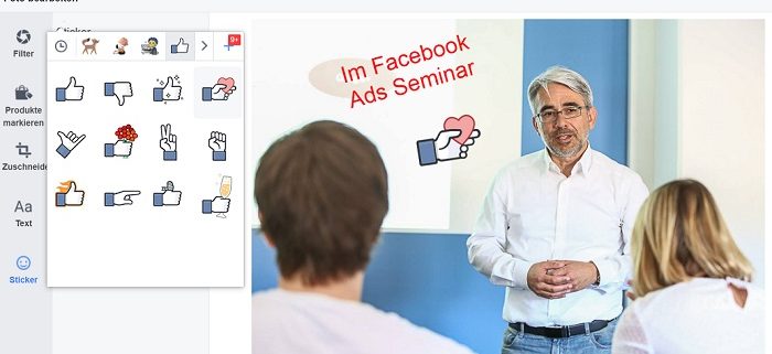 Ein kleines Menü führt zu den neuen Möglichkeiten. Entweder direkt zur Produktmarkierung (bei Fanpages, kommt im weiteren Menü aber noch einmal) oder zur Auswahl “Foto bearbeiten” mit folgenden Features: