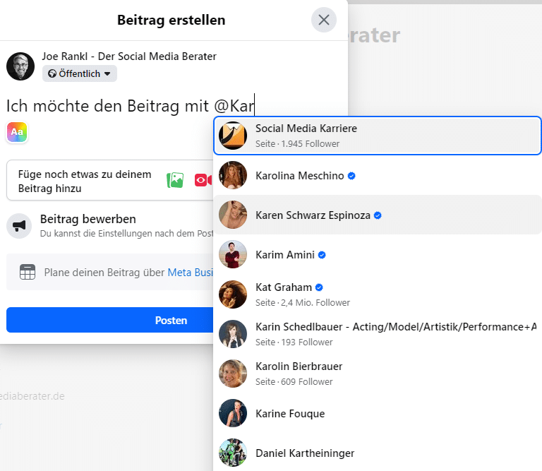In einem Facebook Post kommen die Vorschläge zur Verlinkung schon automatisch, wenn der geschriebene Text einem Seitennamen gleicht. Wer gezielt eine Seite adressieren will, nutzt das @Zeichen und schreibt dahinter den Namen der Facebook Seite, die verlinkt werden soll.